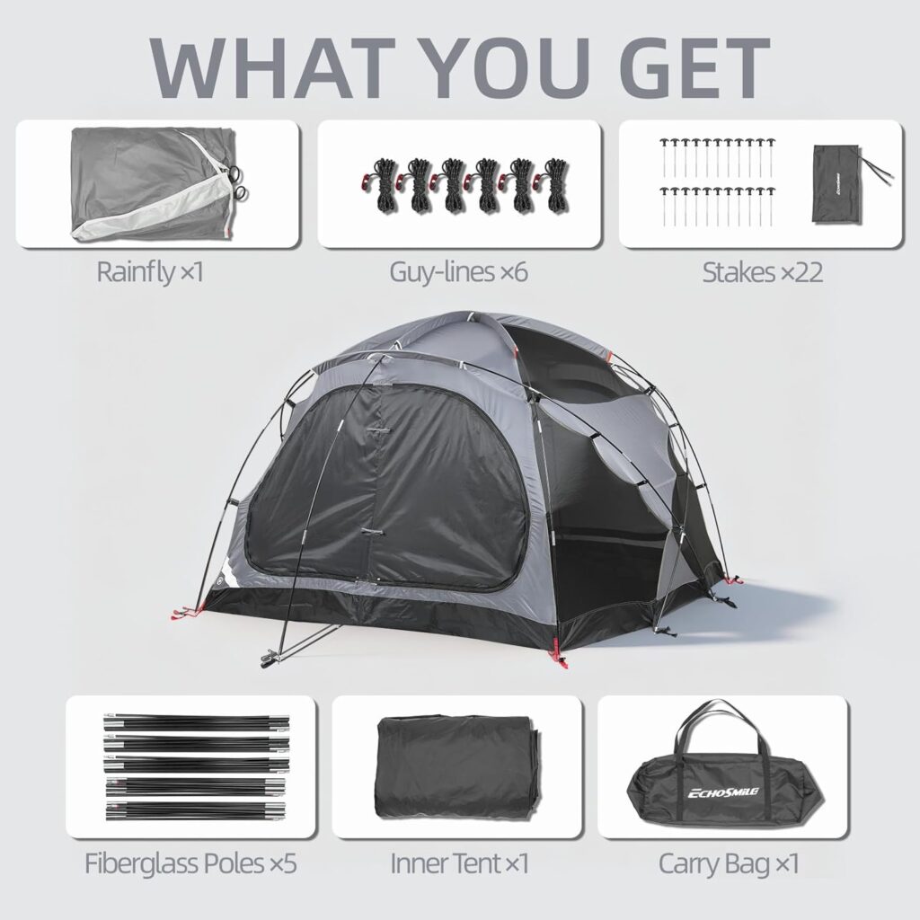 EchoSmile Tents for Camping Stable, spacious, and built for all-weather camping, this dome tent features a reinforced pole frame that improves wind resistance and overall durability. The roomy interior comfortably sleeps 3–5 people, while waterproof fabric, sealed seams, and a durable floor help keep you dry. With excellent ventilation, easy setup, and convenient power access ports, it’s a practical choice for family and group camping trips.