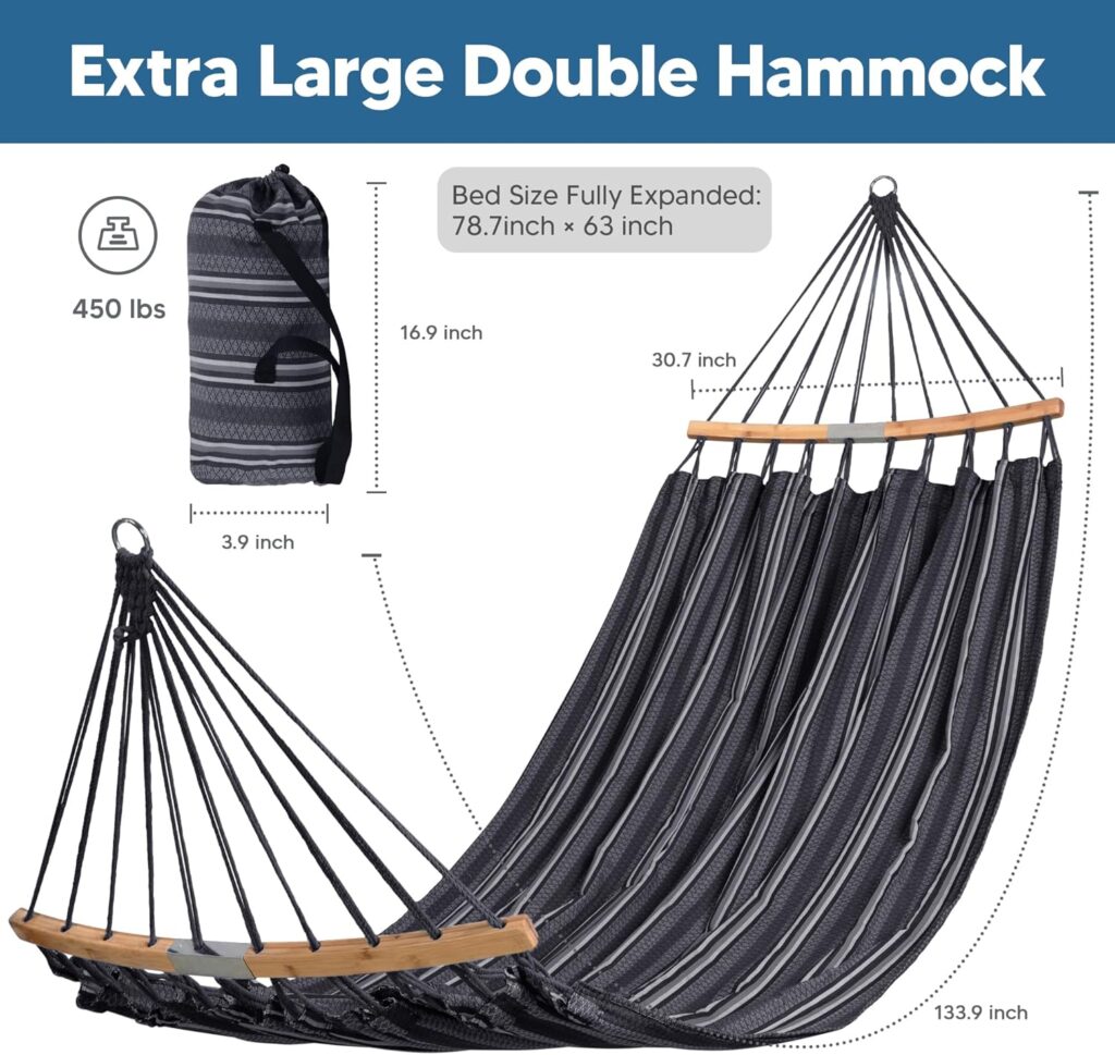 SUNCREAT Portable Double Hammock with Curved Spreader Bar two-person quilted hammock features a soft, double-layer polyester fabric with plush padding and a built-in head pillow for extra comfort. The fade-resistant material makes it ideal for regular outdoor use while camping or relaxing at home.