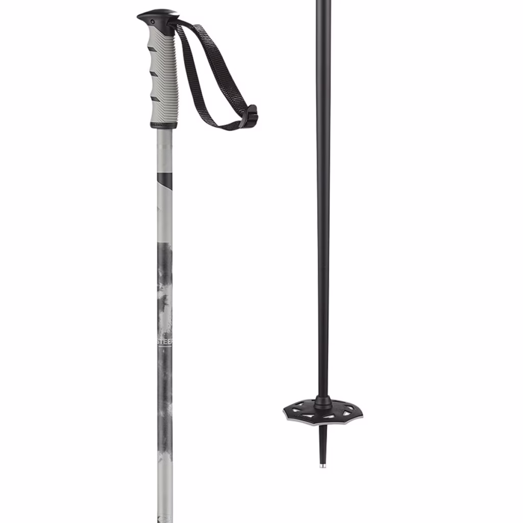 Salomon Steep Ski Poles – Ski these are freeride-oriented poles with heavy-duty aluminium shafts (≈ 18mm), a large powder basket (≈ 95mm), dual material ergonomic grip, carbide steel tip, multiple length sizes (100-135cm). Designed for handling aggressive terrain and deep snow.